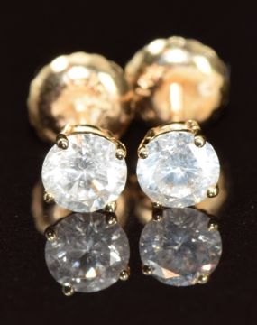 A pair of 14k gold earrings each set with a round cut diamond of approximately 0.25ct, 0.6g, with certificate