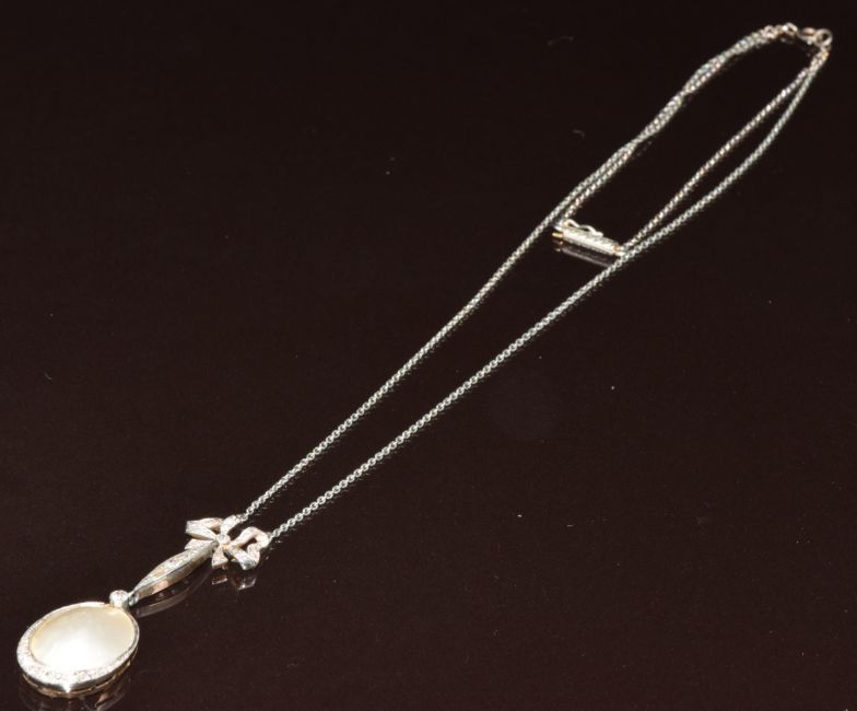 Belle Époque 9ct gold necklace in the form of a bow, with drop section set with a blister pearl, old and rose cut diamonds, 10.1g, chain 36cm and pendant 5cm