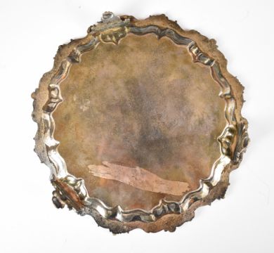 Walker & Hall Victorian hallmarked silver salver or card tray with decorative shaped edge, raised on three feet, Sheffield 1899, and also with maker's name and flag to underside, diameter 22cm, weight 315g