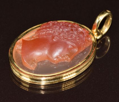 A c1900 18ct gold pendant set with a hardstone agate cameo depicting a young man, mount marked JR, 17.1g 3 x 2.6cm