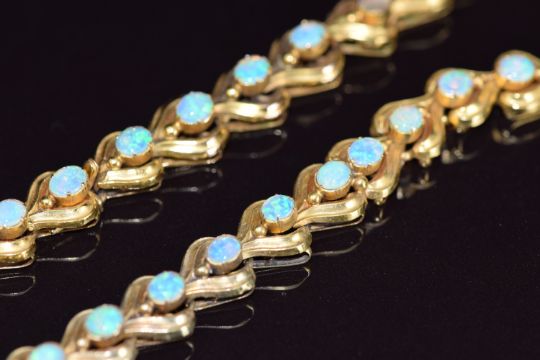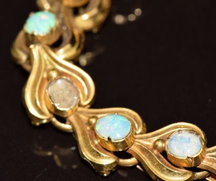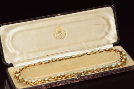 A c1900 18ct gold necklace set with oval opal cabochons, in original Joseph Heming & Co box, 28.7g, 35cm