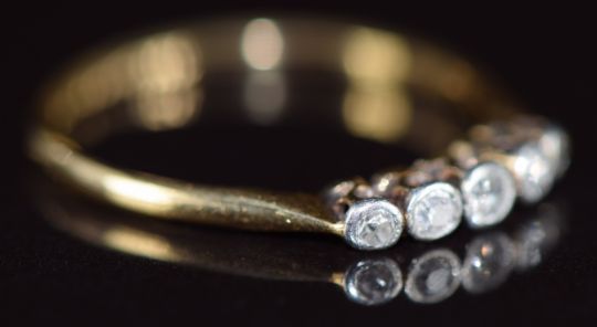 An 18ct gold ring set with five diamonds in a platinum setting, 1.4g, size M