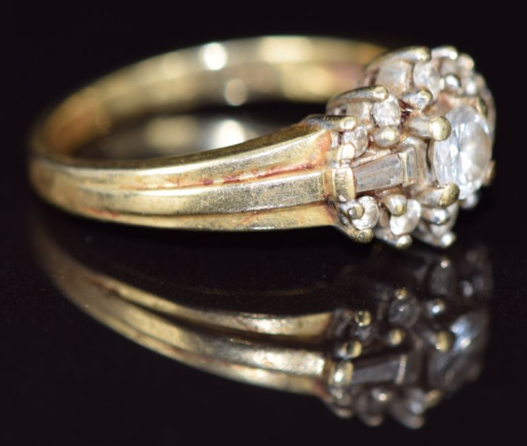An 18ct gold ring set with round and baguette cut diamonds, 4.9g, size L