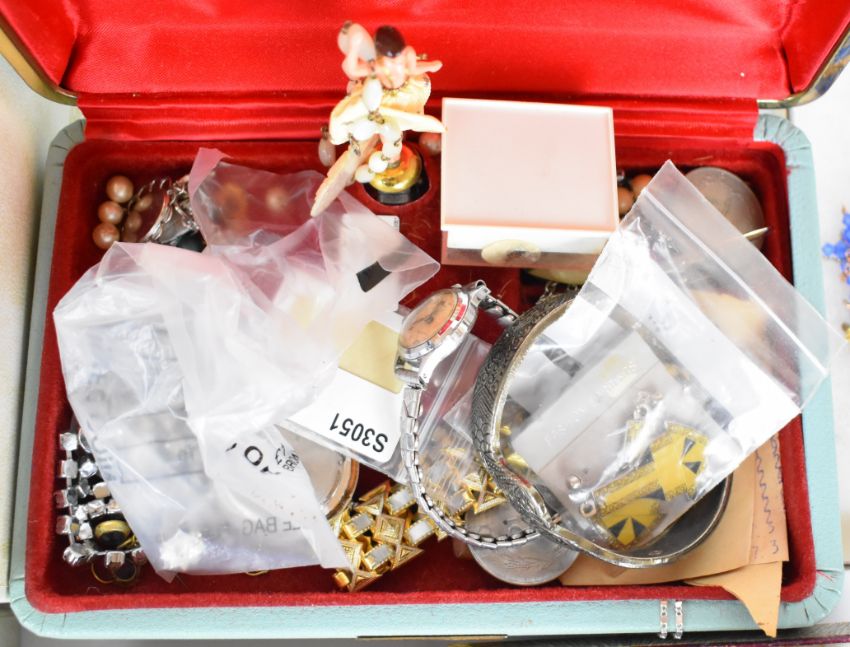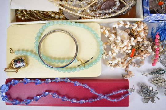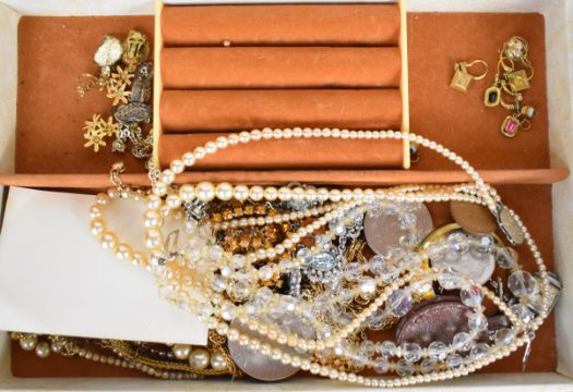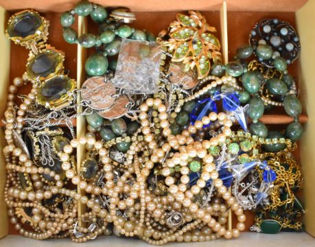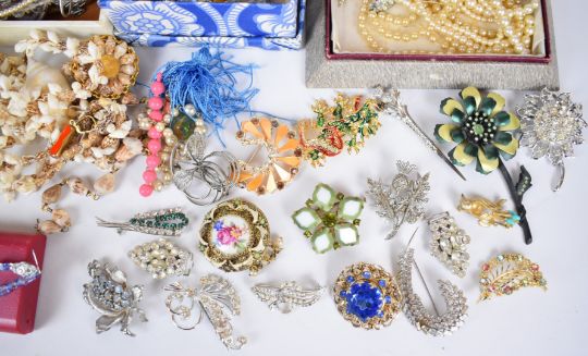A large collection of costume jewellery including Art Deco crystal necklace, diamanté necklaces, gold plated earrings, ten 50p coins, vintage brooches, etc