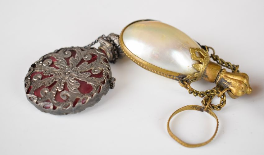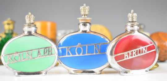 Collection of scent / perfume bottles including carved nut, Mauchline ware case for Mostyn Terrace, Eastbourne, Berlin, Koln etc, tallest 8cm