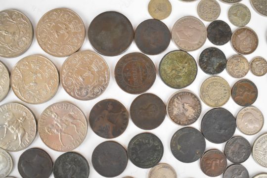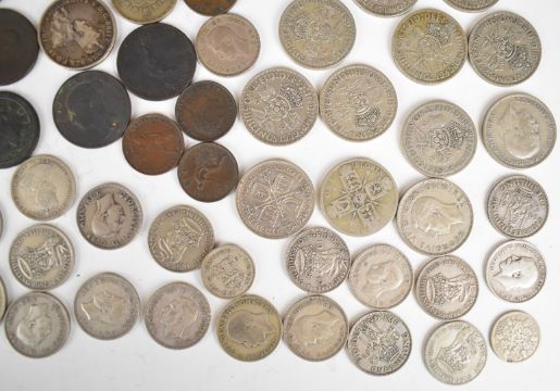 Approximately 755g of pre 1947 English silver coinage including gradable examples, together with three various 1947 coins, seven 1977 crowns and a quantity of Georgian and Victorian copper coinage and various world coins