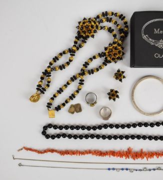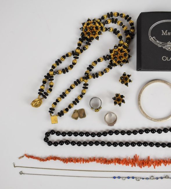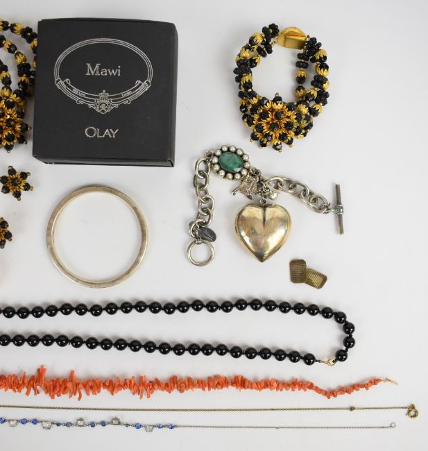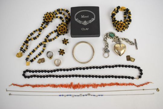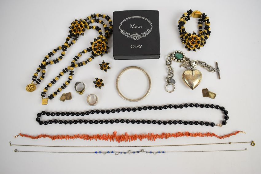 A suite of 1960's costume jewellery comprising earrings, necklace and bracelet, glass necklace with 9ct gold clasp, coral necklace with 9ct gold clasp, Art Deco necklace, silver bracelet by Mawi London, two silver rings and a silver bangle