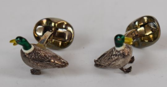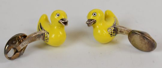 Two pairs of Deakin & Francis silver cufflinks, one pair in the form of a duck with enamel decoration and the other a rubber duck set with yellow enamel, both in original boxes