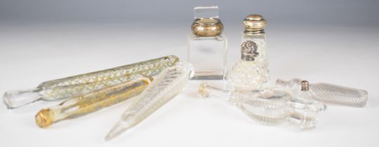 18th / 19thC glass scent / perfume bottles including examples with hallmarked silver / white metal mounts, tallest 19cm
