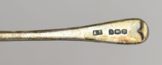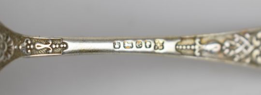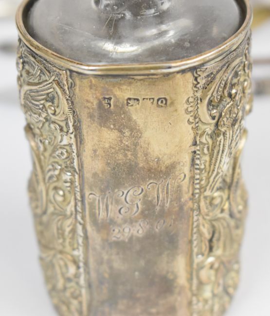 Hallmarked silver and similar items comprising Arts and Crafts style spoon and fork with hammered finish, Victorian and later hallmarked silver cutlery including a Scottish spoon, hallmarked silver napkin ring and 800 grade souvenir spoons and a hallmarked silver mounted glass perfume bottle, weight excluding glass 241g, hallmarked silver handled knife and two silver cased pocket watches. PLEASE NOTE ALL BLADED ITEMS ARE SUBJECT TO OVER 18 CHECK ON COLLECTION OR DELIVERY
