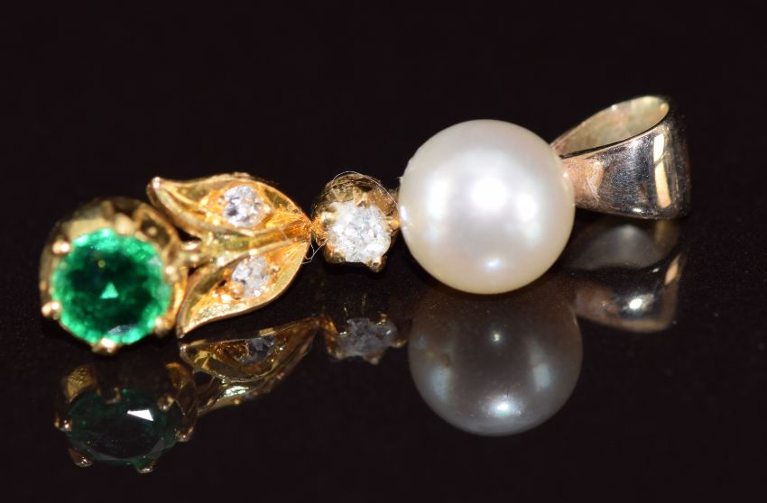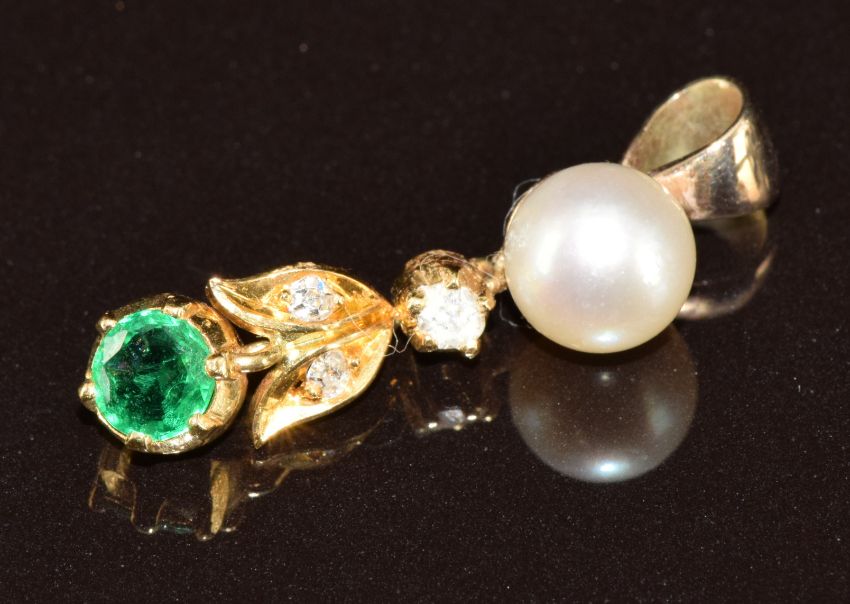 A 9ct pendant set with a round cut emerald of approximately 0.3ct, old cut diamonds and a cultured pearl measuring approximately 6.4mm, 1.9g, 2.5cm