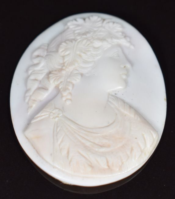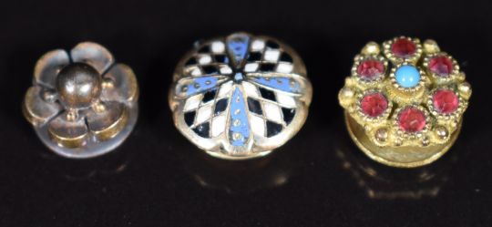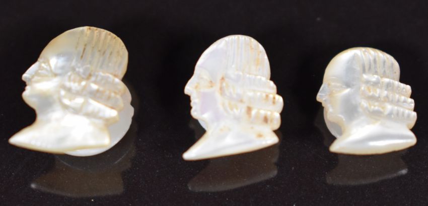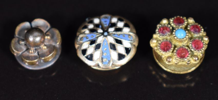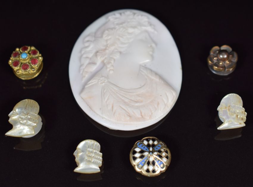 Three mother of pearl studs / buttons in the form of men, a cameo depicting a young woman, yellow metal button / stud set with enamel, yellow metal floral stud and Victorian gilt stud