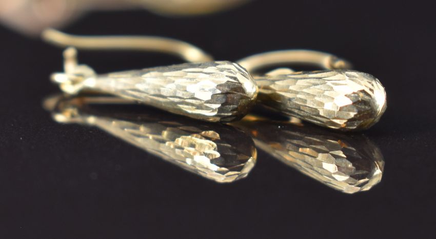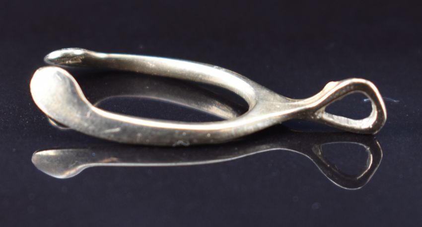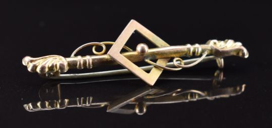 Victorian 9ct rose gold morning brooch marked Collins 3674 Patent, another 9ct gold brooch, 9ct gold pendant in the form of a wishbone, three pairs of 9ct gold earrings (13g all in) and a 14k gold earring by Anfora (3.6g)