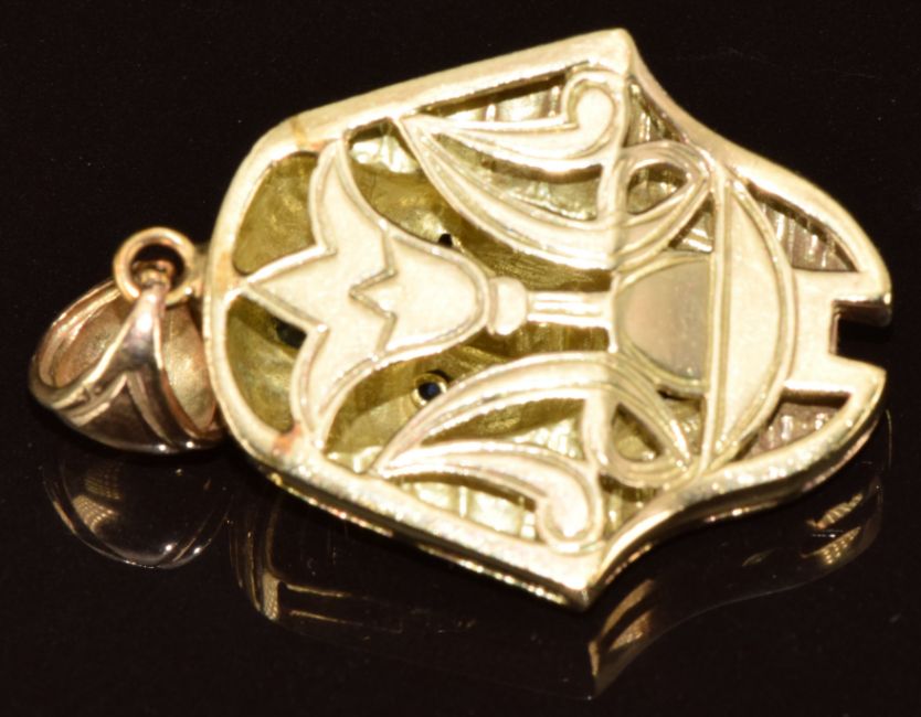 A yellow metal pendant in the form of a pharaoh set with sapphires (tests as 9k gold), 11.5g, 4.2 x 2.1cm