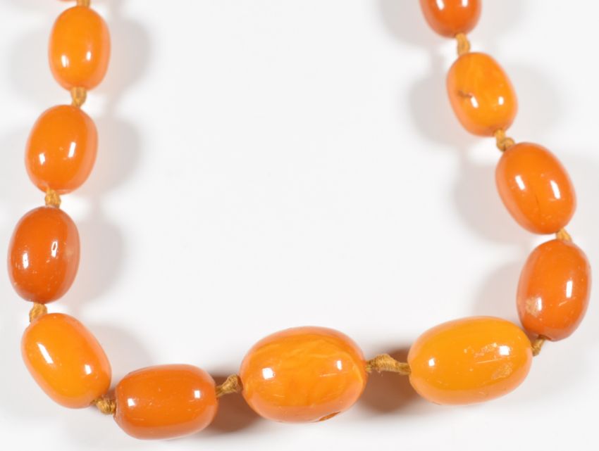 Baltic amber necklace made up of 98 graduated oval beads, the largest 14.4 x 18.4mm and smallest 5.5 x 8.2mm, 48.1g, 128cm