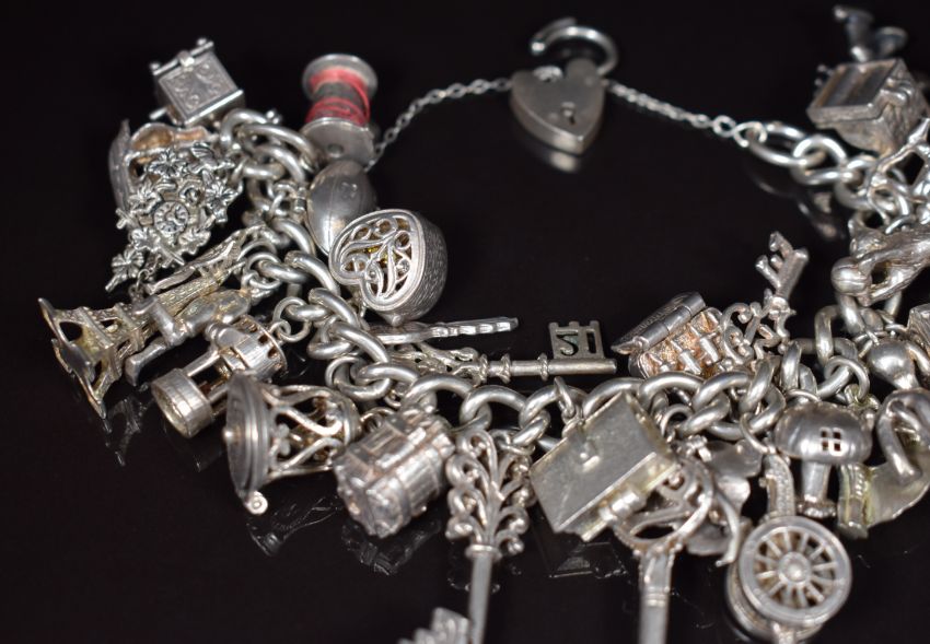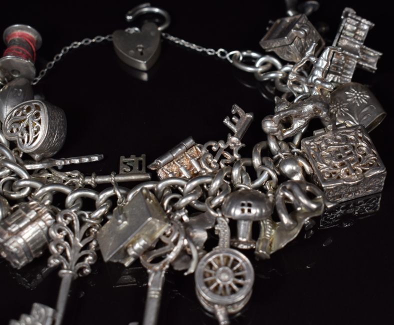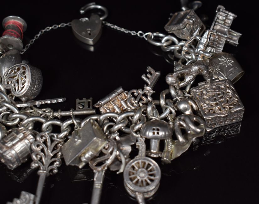 A silver charm bracelet with thirty silver charms including keys, Nuno flower opening to reveal a bee, coffee machine opening to reveal a cup of coffee, mushroom opening to reveal a pixie, etc, 143g