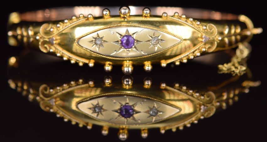 A 9ct gold bangle set with an amethyst and two old cut diamonds, Birmingham 1918, 12.2g, 6 x 5.2cm