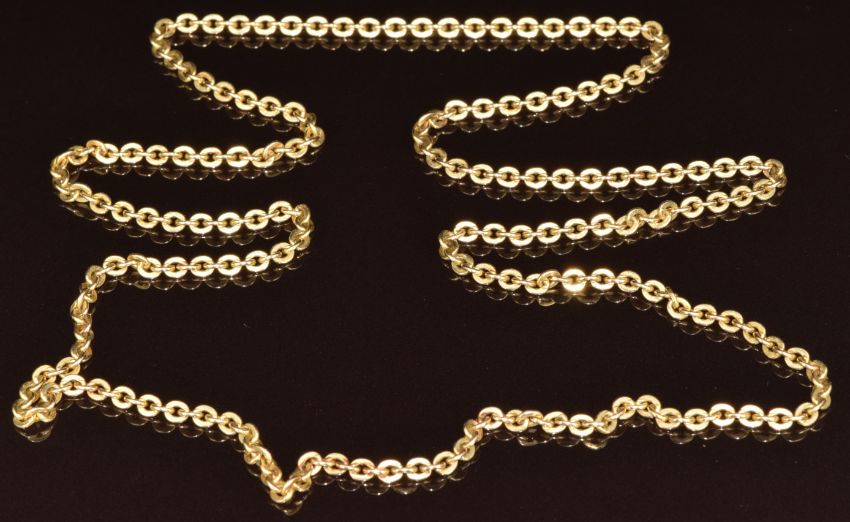 A yellow metal necklace / chain made up of oval links (tests as 9ct gold), 29.5g, 84cm