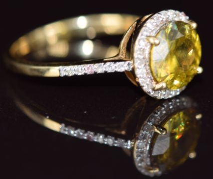 An 18k gold ring set with a round cut sphene of approximately 1.5ct surrounded by diamonds and further diamonds to the shoulders, 2.8g, size N