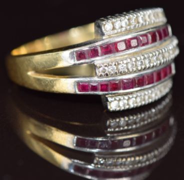 An 18ct gold ring set with calibre cut rubies and round cut diamonds, the total ruby weight approximately 1.3ct and diamonds 0.32ct, 9.4g, size T/U
