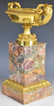 Gilt metal and marble pedestal twin handled urn, on square base, height 40cm