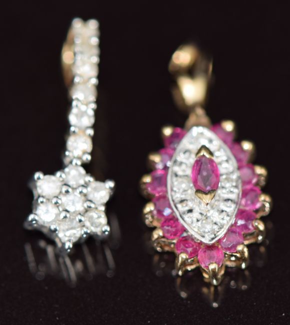 Two 9ct gold pendants, one set with diamonds the other with rubies and diamonds, 1.8g
