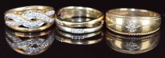 Three 9ct gold rings set with diamonds, 9.8g, sizes U, N & O