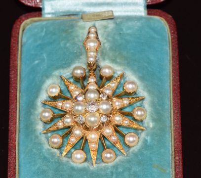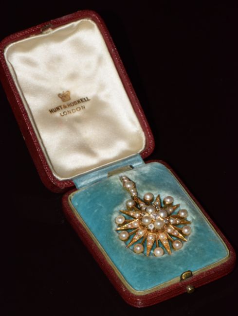 Late Victorian metamorphic pendant/ brooch set with old cut diamonds and split pearls, with removable pendant loop and attachable brooch pin, in original fitted Hunt & Roskell box, 4.2 x 3cm