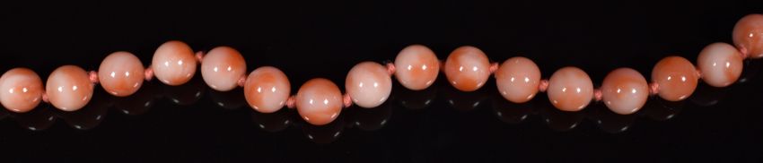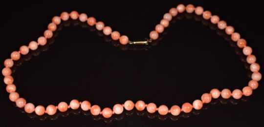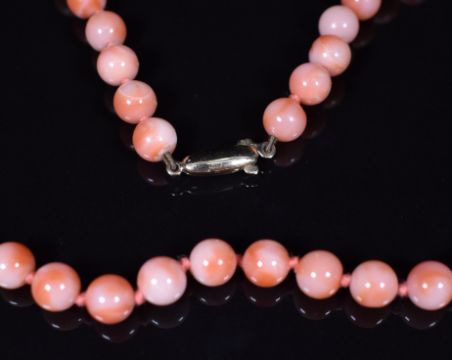 A strand of coral beads with 9ct gold clasp, each bead approximately 6.4mm, 21.8g, 44cm
