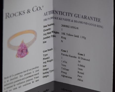 An 18k gold ring set with a trilliant cut Patroke kunzite of approximately 1.4ct, with diamond encrusted shoulders, 2.2g, size N