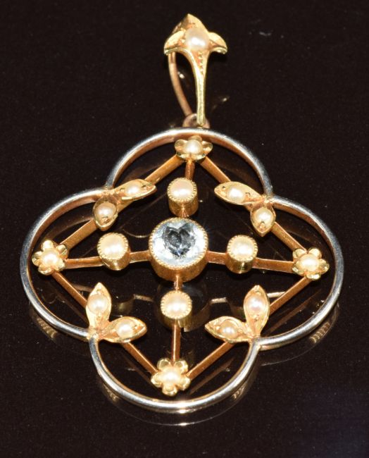 Edwardian 9ct gold pendant set with an aquamarine and seed pearls, 3.3g, 2.6cm