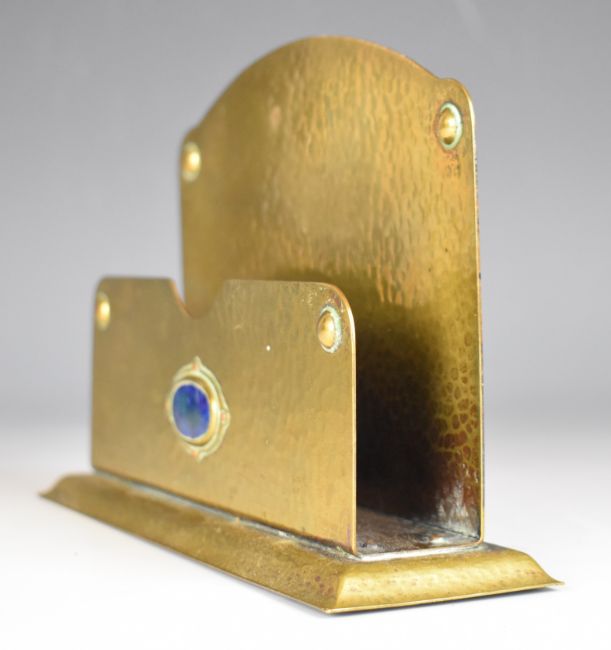 Liberty style Arts and Crafts or Art Nouveau brass letter rack with hammered decoration and central enamel cabochon, marked to underside Cambray ware, length 19cm