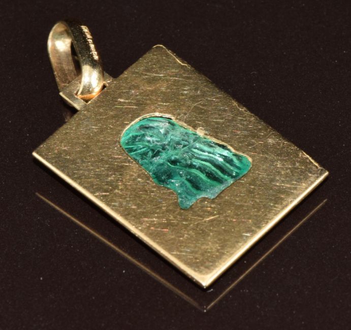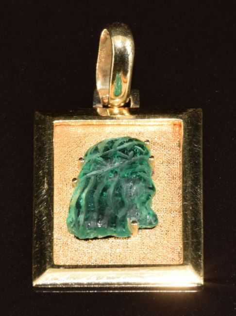 A 14k gold pendant set with an emerald cut to resemble a man or Jesus, 6.8g, 3.5 x 2cm