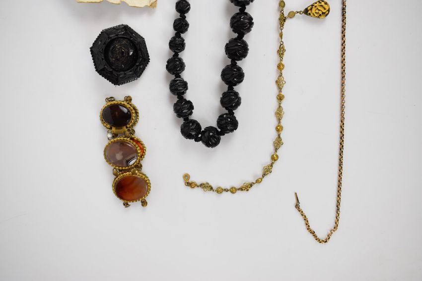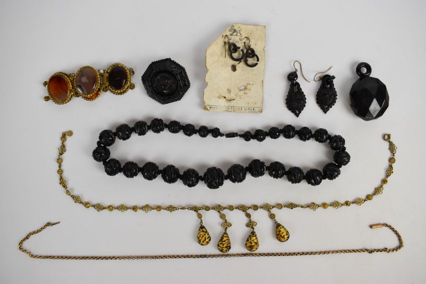 Four pieces of jet jewellery including carved beaded necklace, carved earrings, brooch carved with floral decoration and a faceted locket together with an agate bracelet, gilt necklace with glass pendants and gold plated necklace