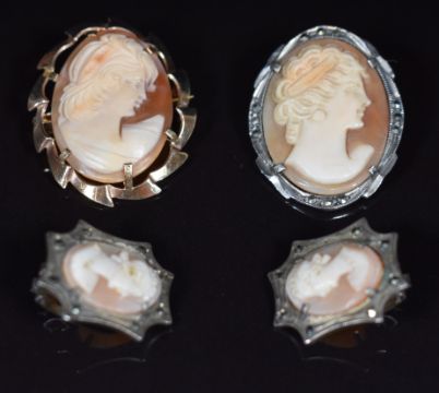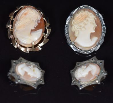 A 9ct gold metal core bangle, 9ct gold earrings (1.1g), 9ct gold brooch set with a cameo, yellow metal anchor pendant (0.8g, tests as 9k gold), and cameo earrings and brooch