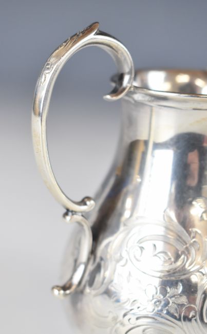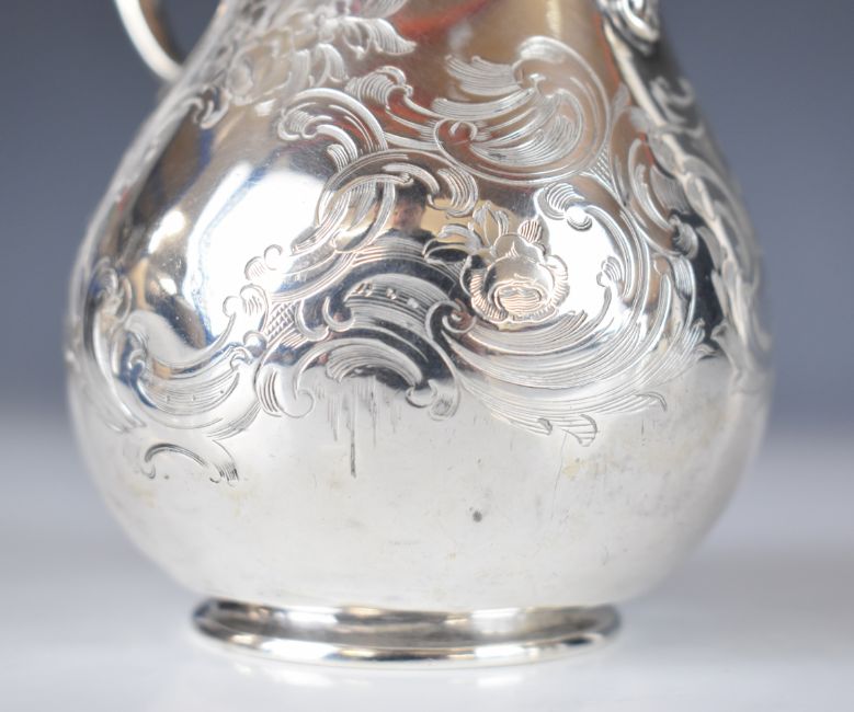 Victorian hallmarked silver milk or cream jug with engraved decoration and scroll handle, London 1850, maker Edward, Edward Junior, John & William Barnard, height 12cm, weight 149g