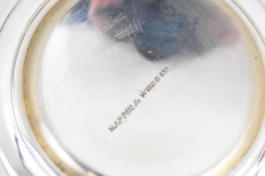 Mappin & Webb George V hallmarked silver twin handled presentation bowl, on original base set with ivorine plaque for Mappin & Webb, London 1919, width 23cm, weight excluding base 433g