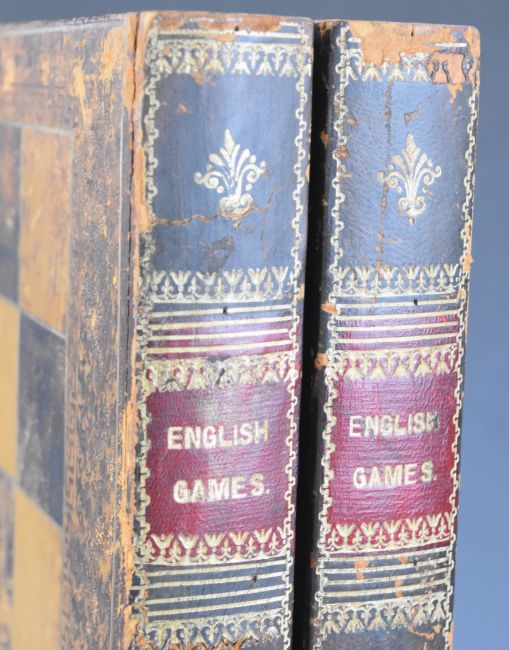 Novelty tooled leather games compendium formed as a pair of books titled English Games, with chess/ draughts board to one side and backgammon to interior, together with a pair of dice shakers, boxed set of TSL draughts and a pair of vintage bone dice, length of book 45cm