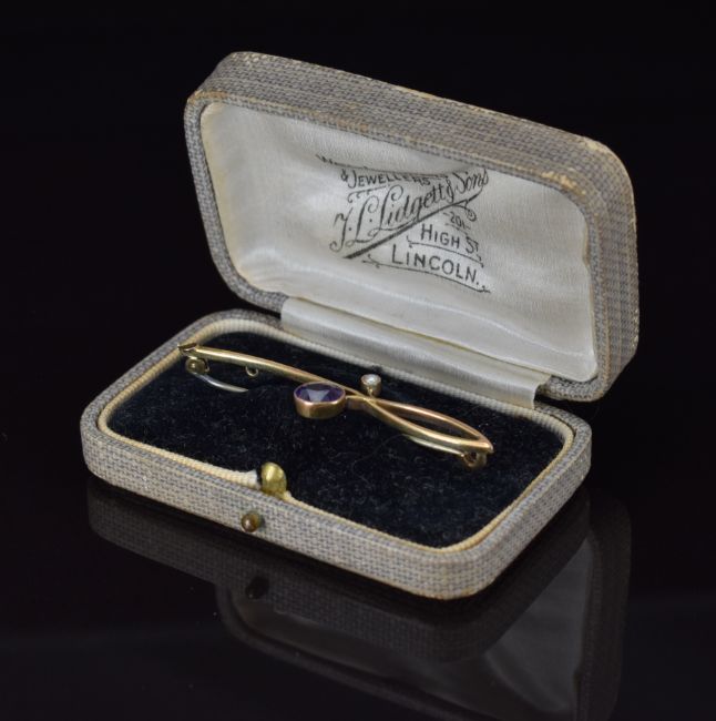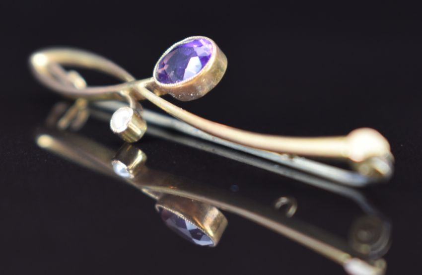A 9ct gold brooch set with an oval cut amethyst and pearl, 2.5g, 5.4cm