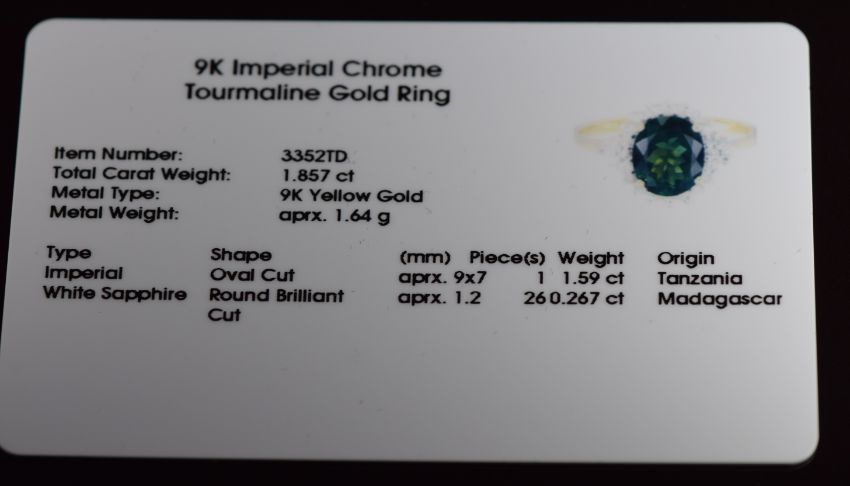 A 9k gold ring set with an oval cut imperial chrome tourmaline of approximately 1.85ct surrounded by white sapphires, 2g ,size N