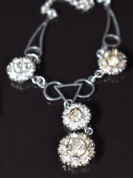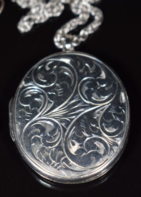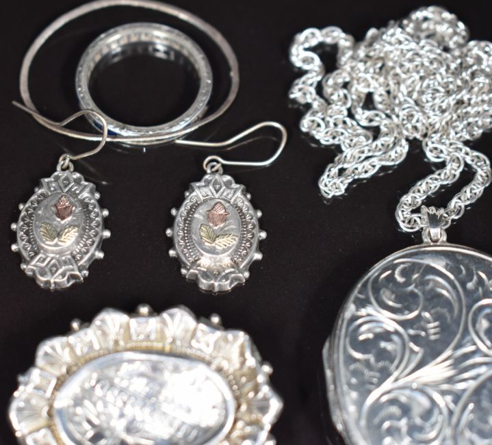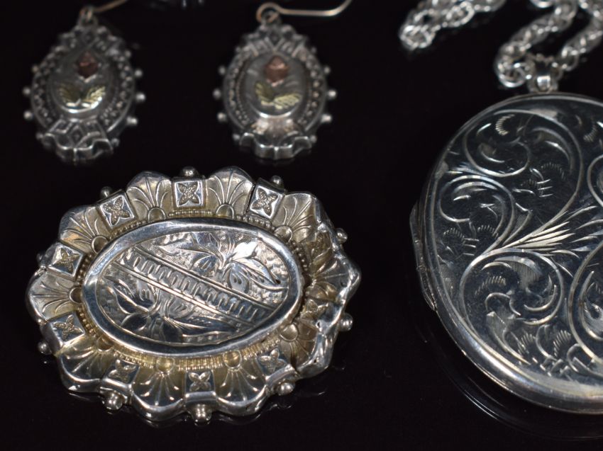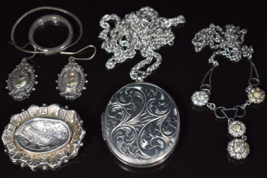 A collection of silver jewellery including locket, chain, brooch, Victorian earrings with applied gold decoration, eternity ring set with sapphires and white sapphires and 1930's necklace set with paste