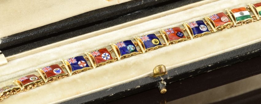 A 14ct gold bracelet made up of flag shaped links set with enamel, each flag representing a country or state and comprising England, Scotland, Ireland, India, Canada, Victoria, New South Wales, Queensland, South Australia, West Australia, New Zealand, Cape Colony, Natal, West Africa, East Africa, Ceylon and Newfoundland, stamped Pegler RD358292 S'Hampton, in original box 'Alfred Pegler, Yachting Jewellery, 15 High Street, Southhampton' 16.3g, 17.5cm