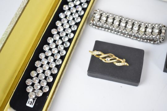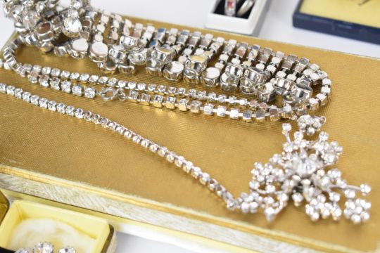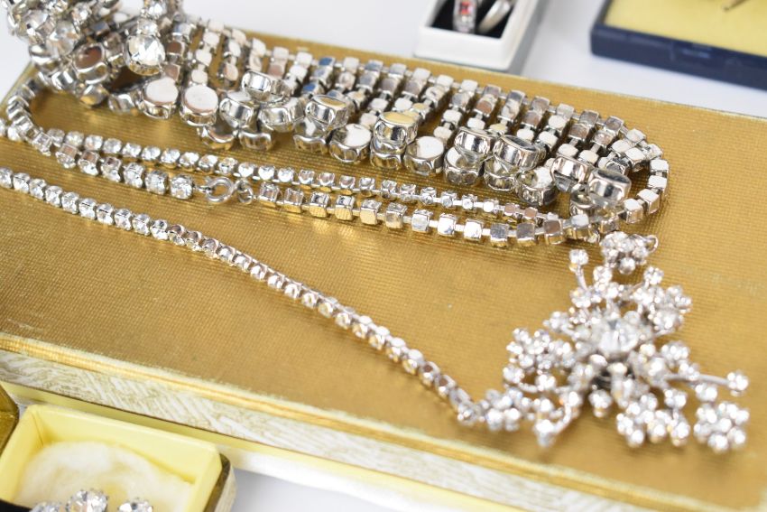 A collection of jewellery including Accurist and Rotary watches, two silver rings, necklaces including Monet, pearl, silver and diamanté, diamanté bracelet, brooches etc