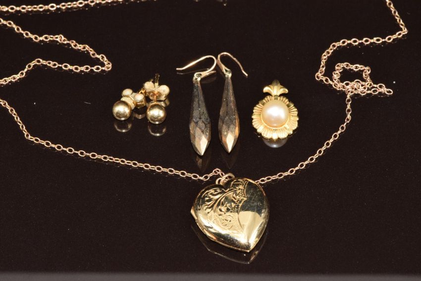 A 9ct gold heart locket on 9ct rose gold chain, and further 9ct gold including faceted and other earrings, pendant set with a pearl, 6g