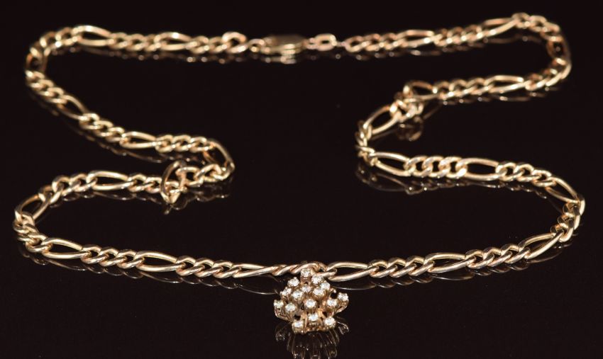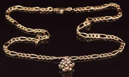 A 9ct gold curb link necklace with 9ct gold pendant set with cubic zirconia, 19.5g, 59cm