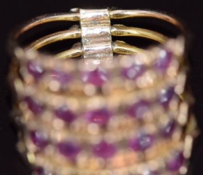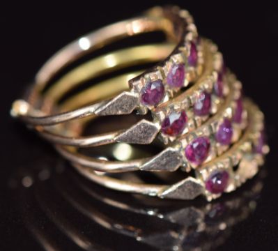 A 9ct gold ring made up of four rings each set with rubies (one missing), 4.1g, size K