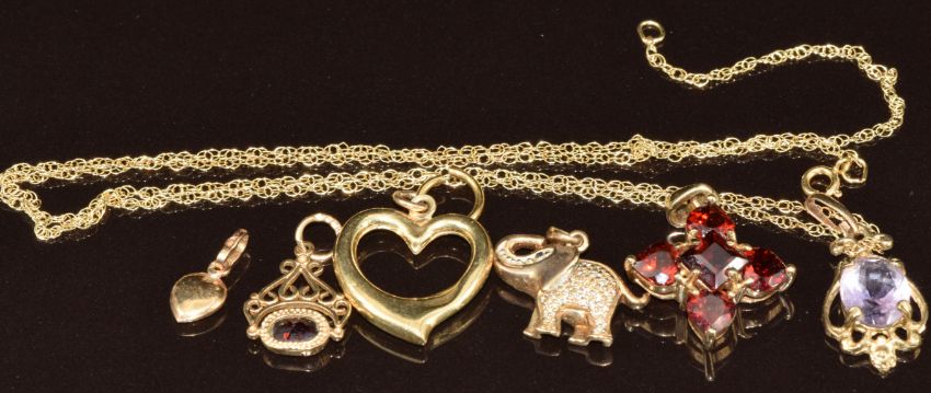 Six 9ct gold pendants including garnet, amethyst, diamond, etc and a 9ct gold chain, 6.7g