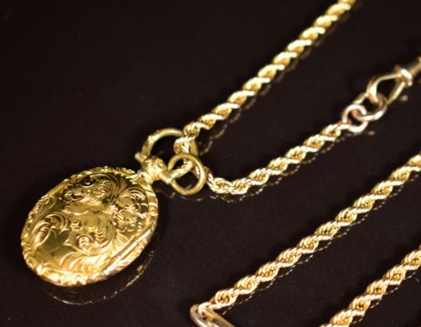A 9ct gold guard chain made up of rope twist and elongated links (23.7g) and a Victorian gold plated locket, 136cm