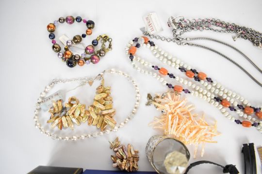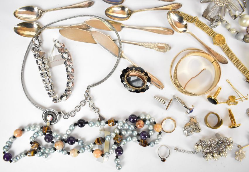 A collection of jewellery including rolled gold bangle, filigree bracelet, silver necklace, silver bracelets, two silver rings, pearl necklaces, Swarovski necklace in original box, Victorian mourning brooch, etc