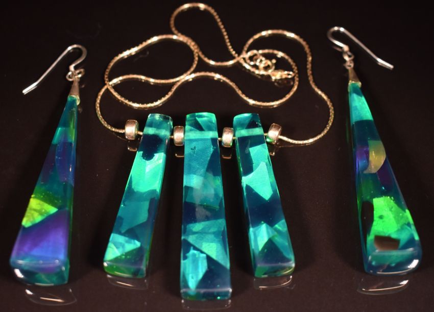 A 9ct gold chain with three acrylic pendants and similar earrings by Stephanie Buddle